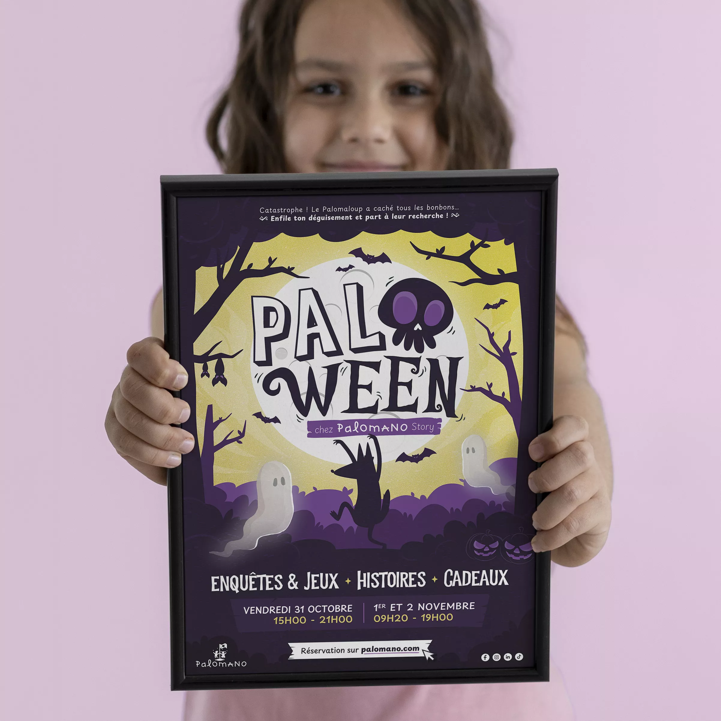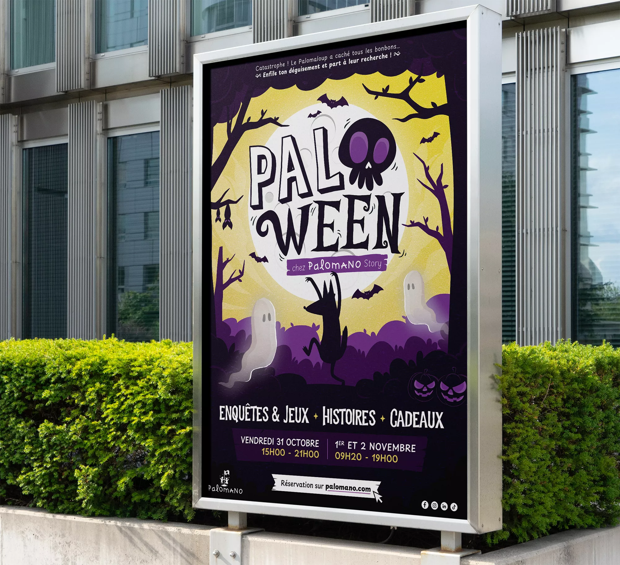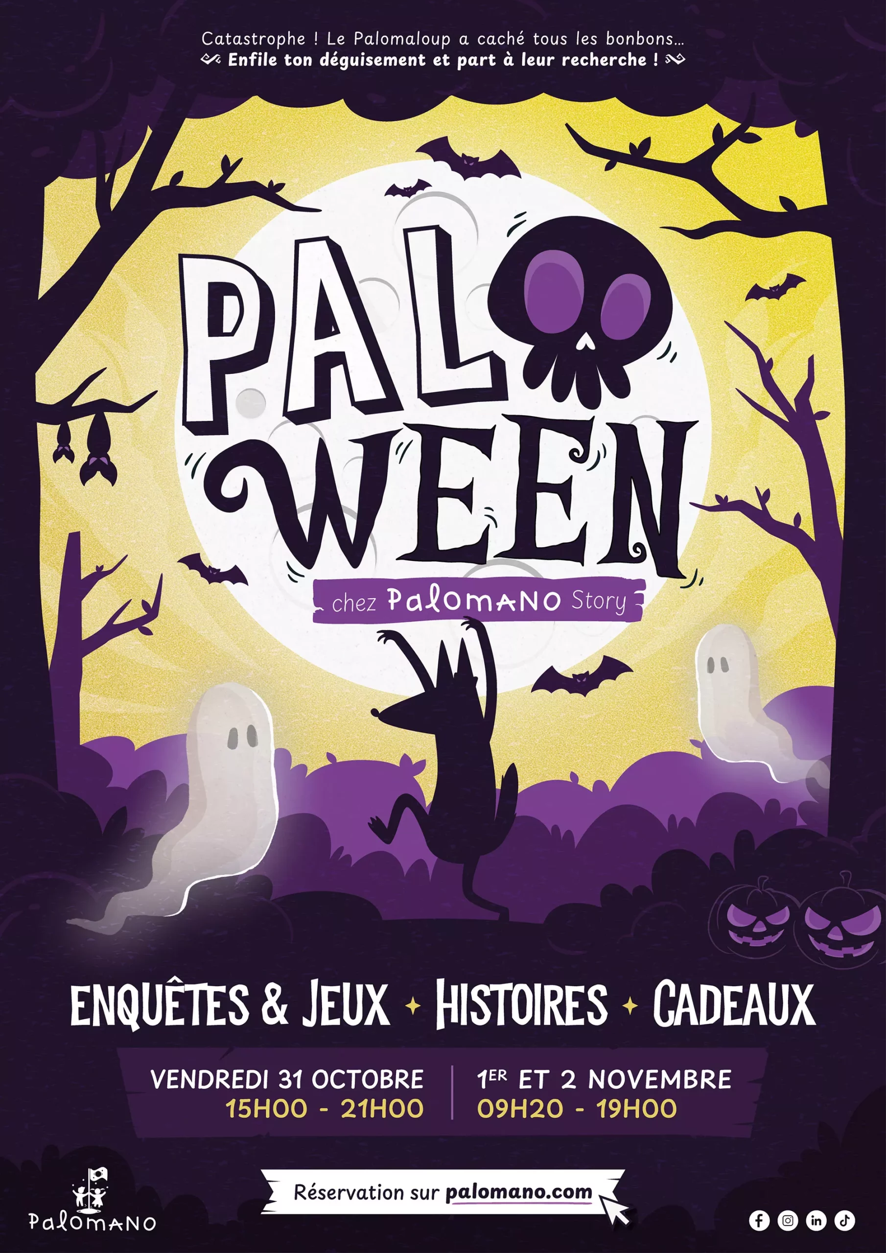 Pour imaginer l’identité visuelle du Paloween 2025, j’ai créé une affiche illustrée déclinée en animation, pensée comme la porte d’entrée d’une aventure ludique et mystérieuse.