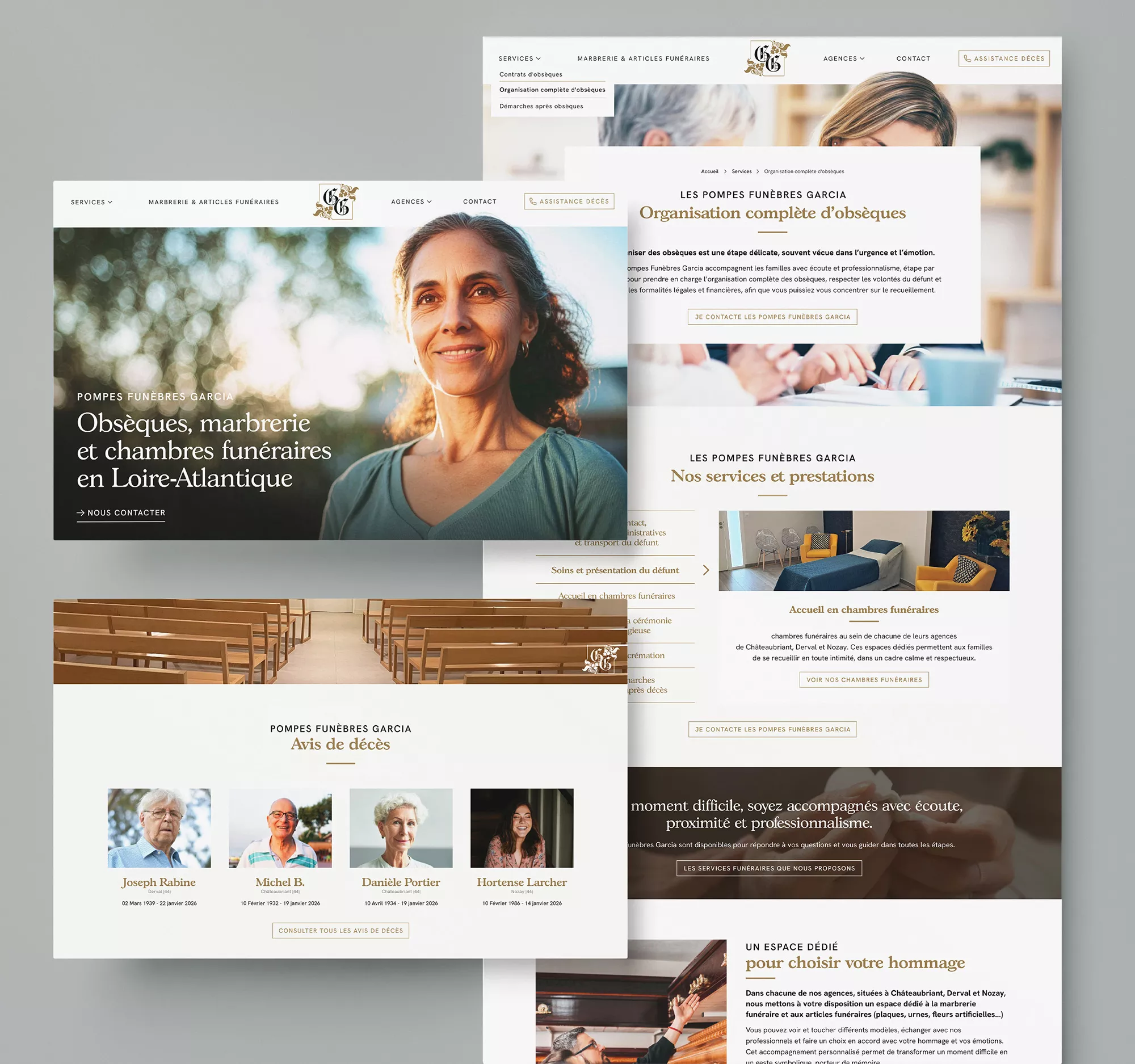 Les Pompes Funèbres Garcia, institution familiale ancrée sur le territoire de Châteaubriant–Nozay, souhaitaient franchir le cap du numérique. L’enjeu était de taille : transformer une image digitale vieillissante en une plateforme accueillante, sans trahir la solennité et l’histoire de l’entreprise.